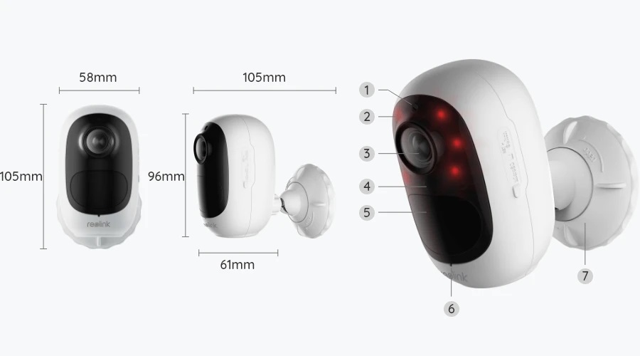 1. Daglichtsensor; 2. 6 IR LED's; 3. Lens; 4. Status LED; 5. Ingebouwde PIR bewegingssensor; 6. Ingebouwde Mic; 7. Buiten bevestigingsbeugel.