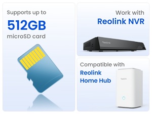 - Opslag mogelijk op micro SD-kaart (max 512GB, lokaal, niet inbegrepen) of Reolink Hub of NVR (optioneel) of Reolink Cloud