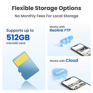 - De camera bevat een voorgeïnstalleerde 64GB micro SD-kaart. Met ondersteuning voor een micro SD-kaart tot 512GB en gecodeerde cloudopslag, zorgt deze camera ervoor dat opnamen veilig worden opgeslagen;