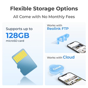 - Lokale opslag op micro SD-kaart (max 128GB), FTP server of Reolink Cloud;