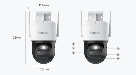 | 1) Spotlight; 2) Infrarood LED; 3) Lens; 4) Mic; 5) Daglichtsensor; 6) PIR-sensor | 1) Micro SD-kaartslot |