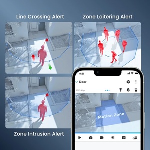 - Perimeterbeveiliging. Ontvang waarschuwingen voor lijnoverschrijding, inbraak in een zone of rondhangende figuren in een zone. Nauwkeurige bescherming van kritieke gebieden;