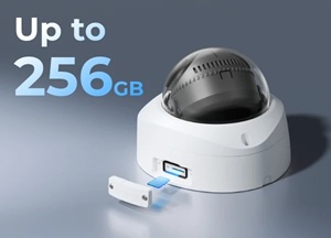 - Opnames kun je opslaan op een Micro SD-kaart (tot 256GB, niet meegeleverd), op een Reolink NVR of FTP server;