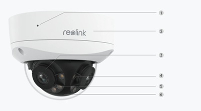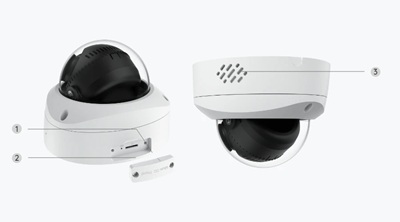 | 1) Microfoon; 2) Logo; 3) Lensrubber; 4) Spotlight & IR LED; 5) Spotlight & IR LED; 6)Daglichtsensor. | 1) Micro SD-kaartslot; 2) Resetknop; 3) Speaker. |