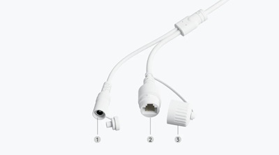 | Afmetingen en verticale kijkhoek. | 1) Stroompoort; 2) Ethernetpoort; 3) Waterproof beschermkap |