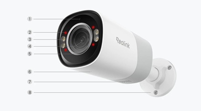 1) Daglichtsensor; 2) Infrarood LED; 3) Spotlight; 4) Lens; 5) Zonnekap; 6) Microfoon; 7) Luidspreker; 8) Bevestiging | 1) Micro SD-kaartslot; |